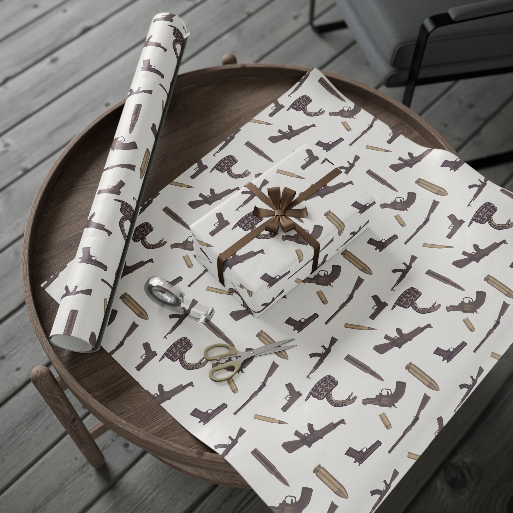 Pew Pew, Merry Christmas to You. Its not for everyone but we think its cute. A variety of guns and ammunition displayed in a modern toile motif. perfect for hunters, 2A enthusiasts and those that just love a sassy print. Product available in glossy or matte finish. Made with 90 gsm fine art paper. One-sided print for easy wrapping