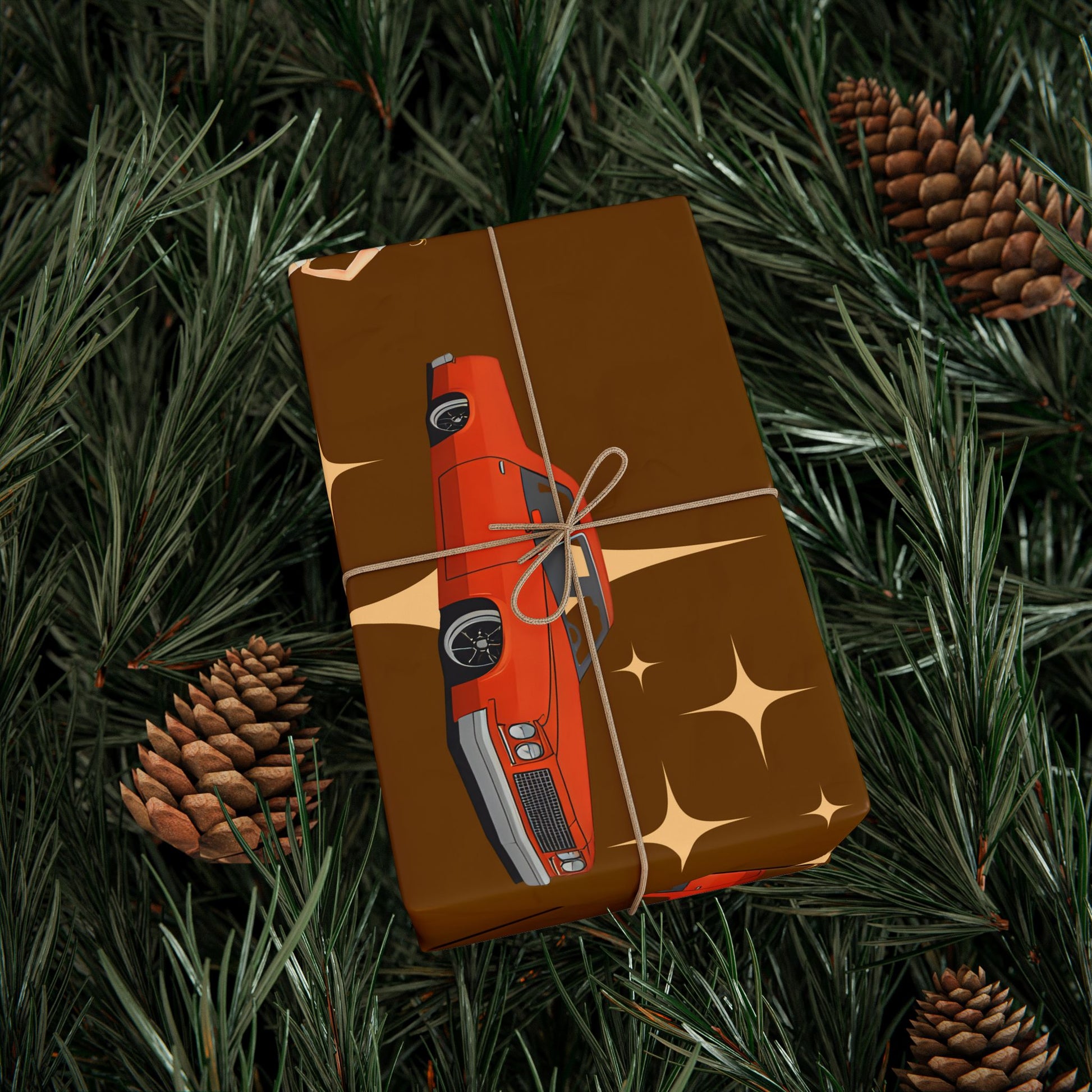 Mocha brown, wrapping paper with a classic car, low rider, pin up girl design, perfect for vintage car enthusiasts and vehicle lovers. Adds a retro style to birthday parties and special occasions.