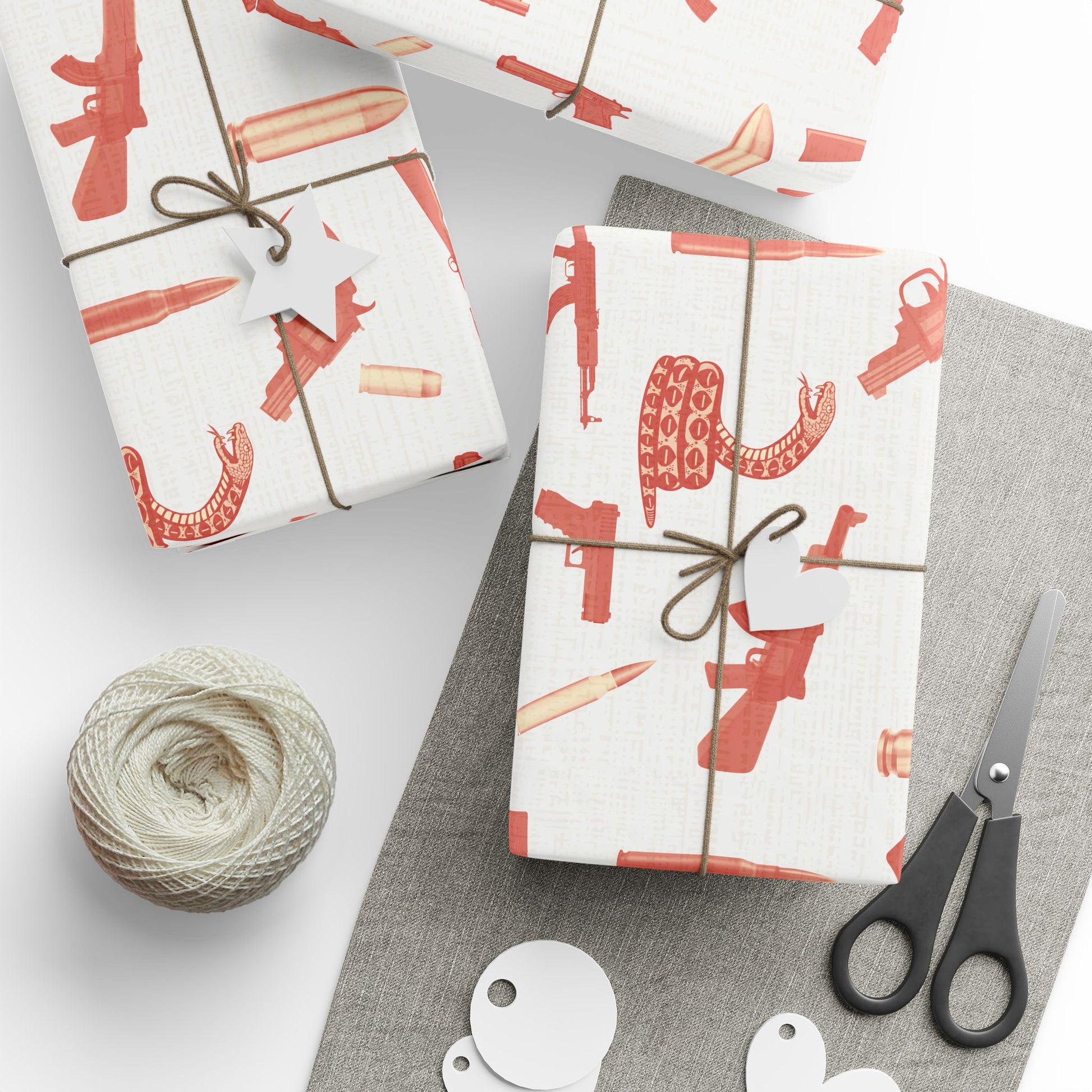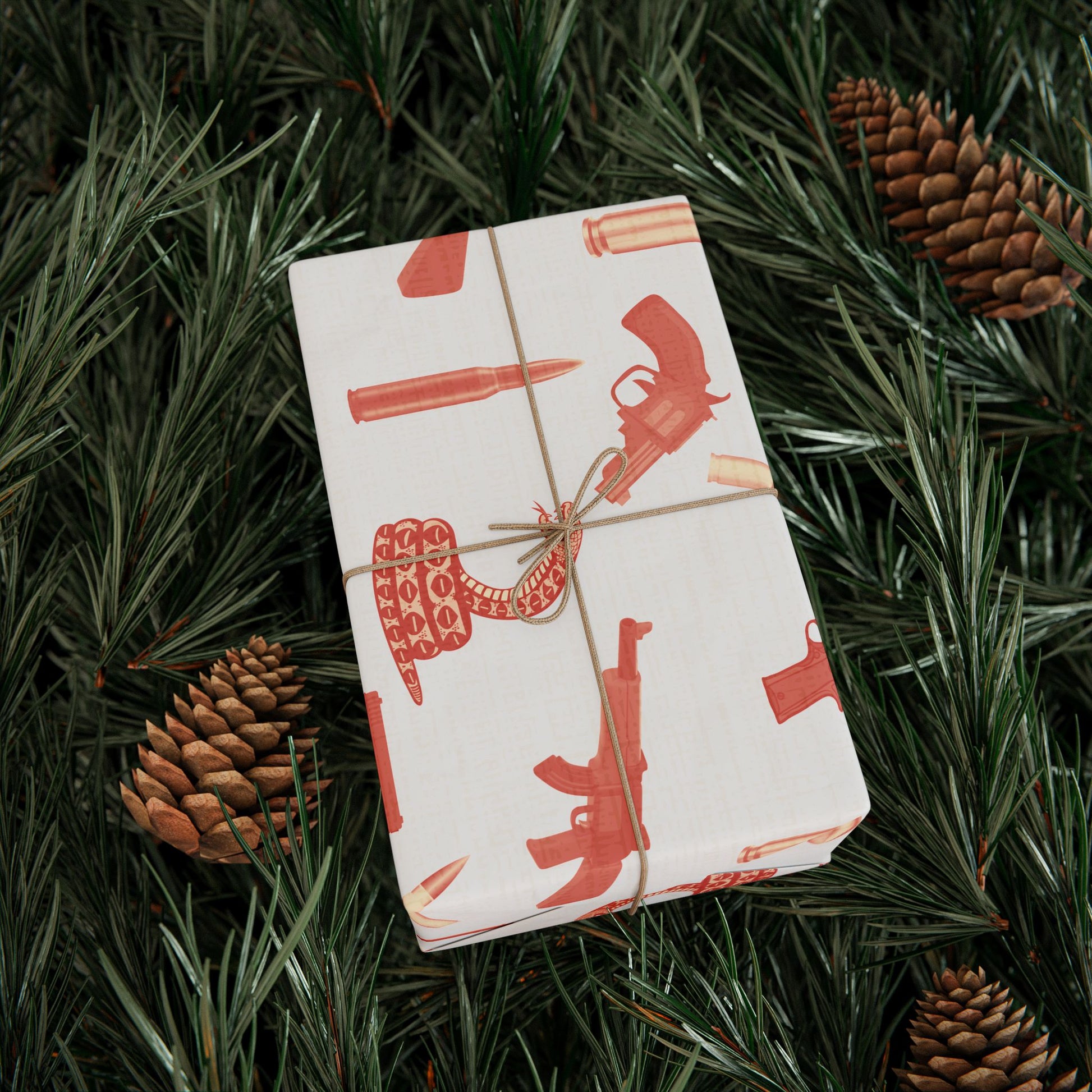 Pew Pew, Merry Christmas to You. Its not for everyone but we think its cute. A variety of guns and ammunition displayed in a modern toile motif. perfect for hunters, 2A enthusiasts and those that just love a sassy print. Made with 90 gsm fine art paper in a subtle glossy finish. One-sided print for easy wrapping