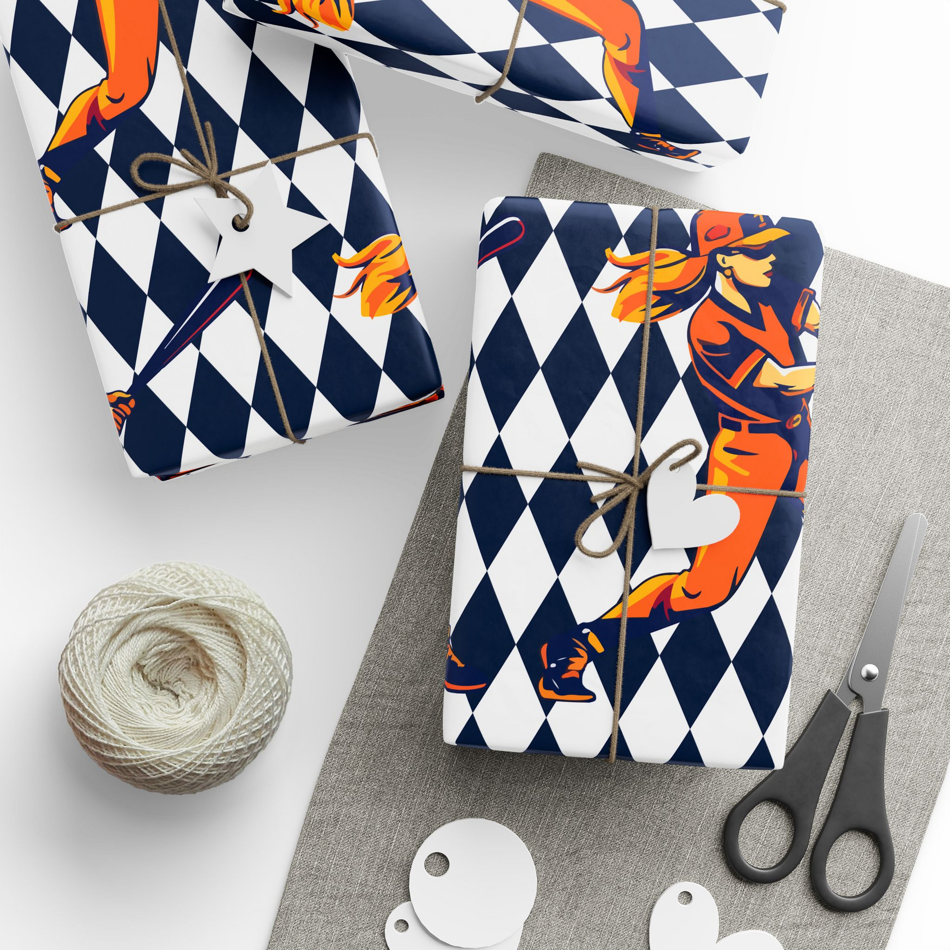 Softball themed gift wrap on a navy harlequin background. This design is a stylish and sophisticated way to wrap gifts for the holidays and special occasions. Made with 90 gsm fine art paper in a subtle glossy finish. One-sided print for easy wrapping